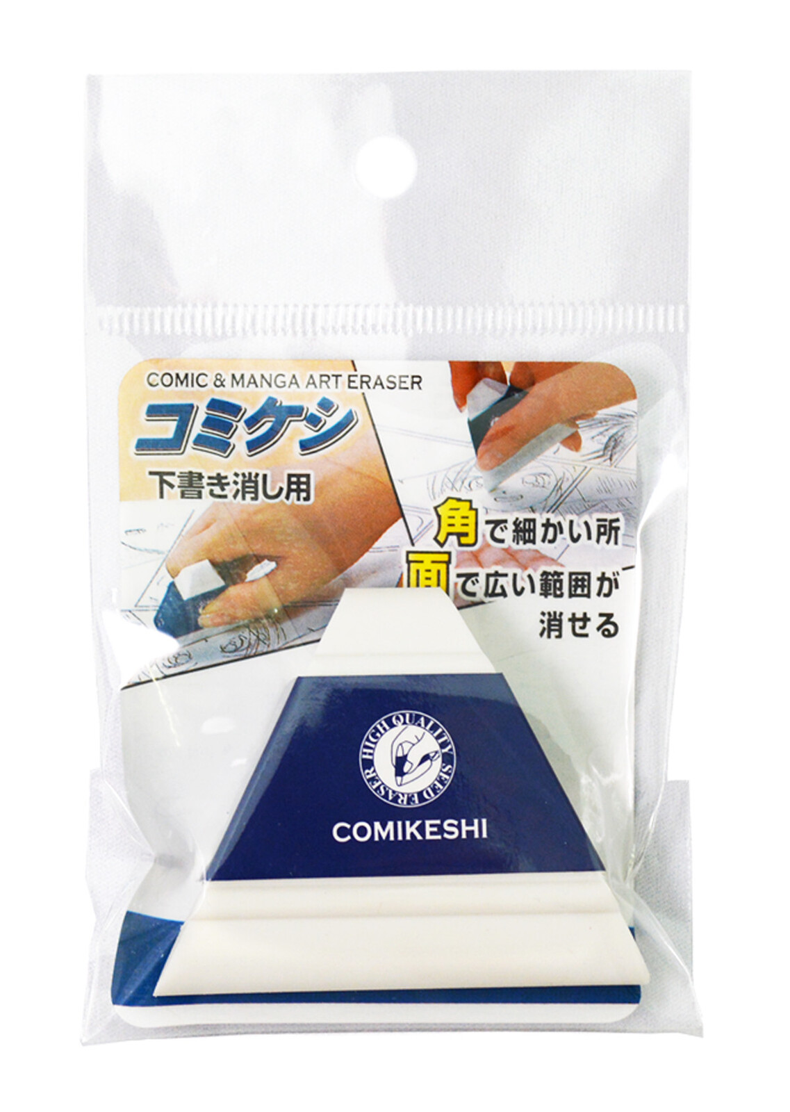Es una goma de borrador con forma triángulo. El diseño destaca su forma y su funcionalidad donde las esquinas se pueden usar para borrar áreas pequeñas del dibujo y de sus lados, para áreas grandes.